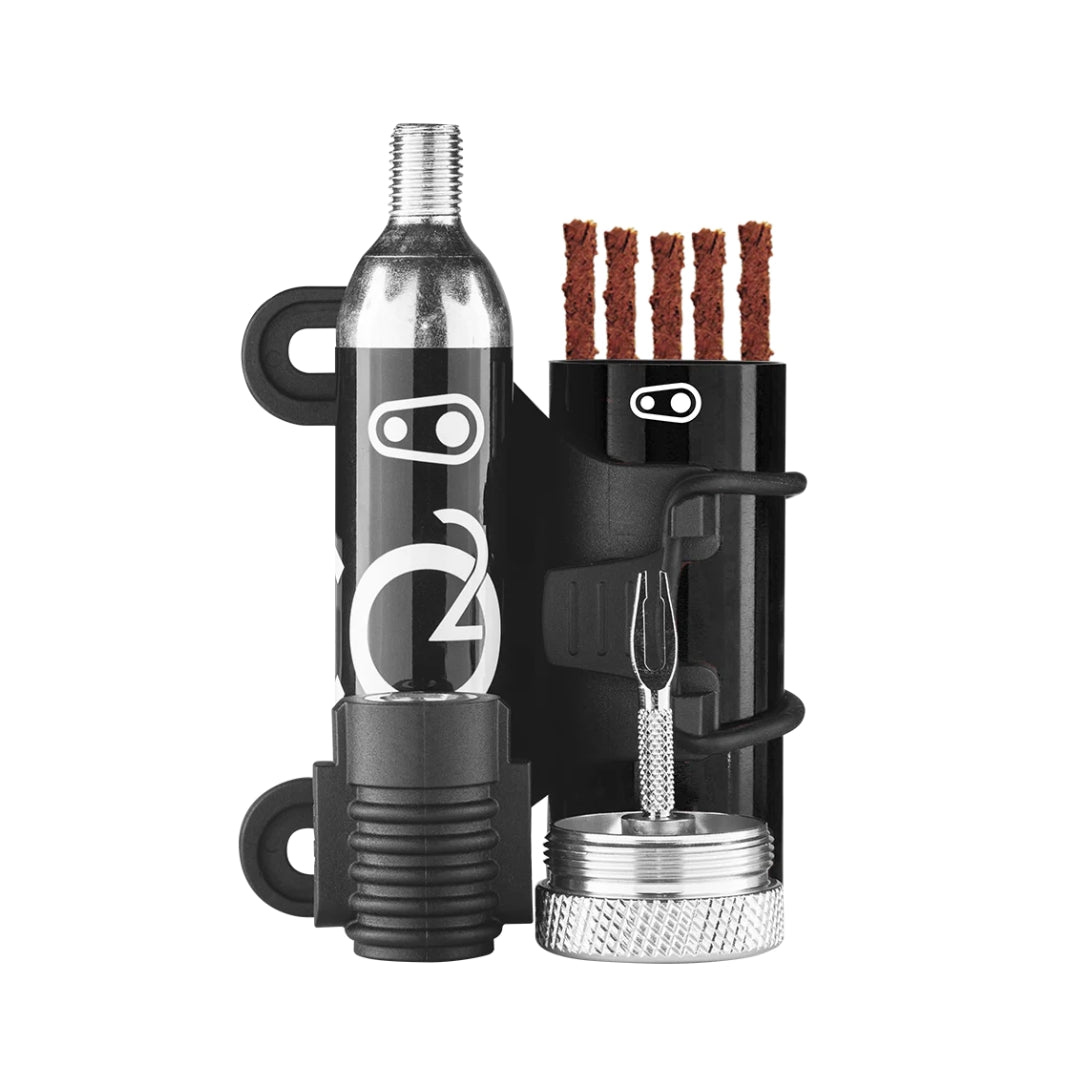 Kit compacto de reparación de neumáticos tubeless con adaptador de CO2.