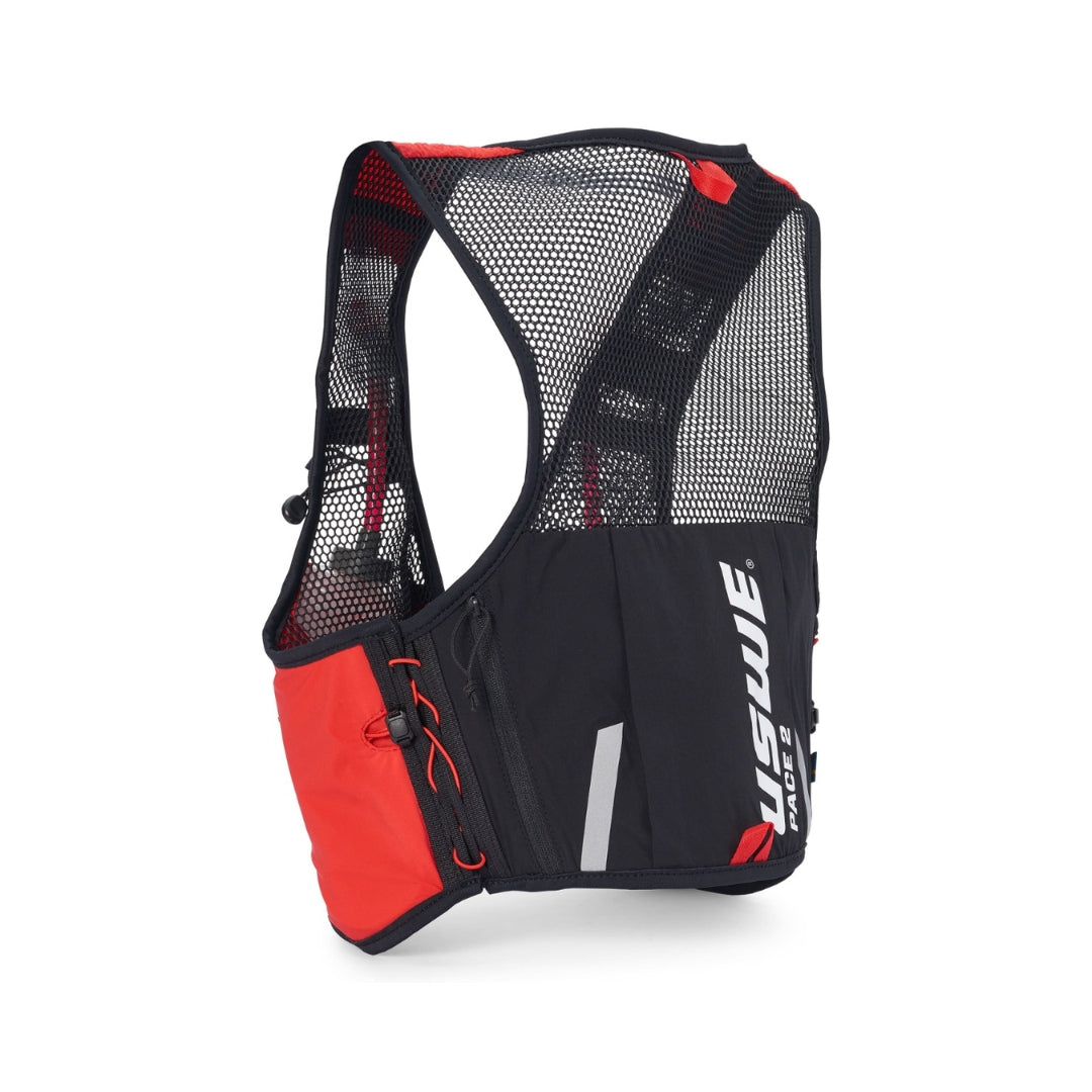 En el chaleco de hidratación para correr PACE se tiene un accesorio para barra frontal, bolsillos frontales en ángulo de 45” para 2 Ultraflasks de 500 ml, dos bolsillos frontales de almacenamiento rápido, bolsillos de hombro para energía/alimentos y dos bolsillos traseros con cremallera. También, hay puntos reflectantes tanto en la parte delantera como en la trasera.