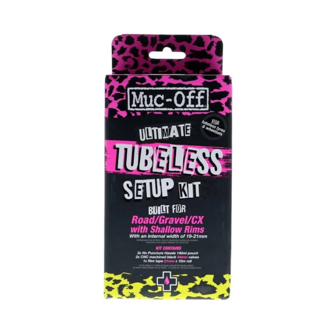 El kit Muc-Off Ultimate Tubeless contiene todo lo necesario para configurar un juego de ruedas sin cámara y listo para rodar. Cada kit contiene una cinta para llantas sin cámara Muc-Off, parches de sellado, 2 válvulas sin cámara negras mecanizadas por CNC y 2 bolsas de sellador tubeless sin problemas de pinchazos.